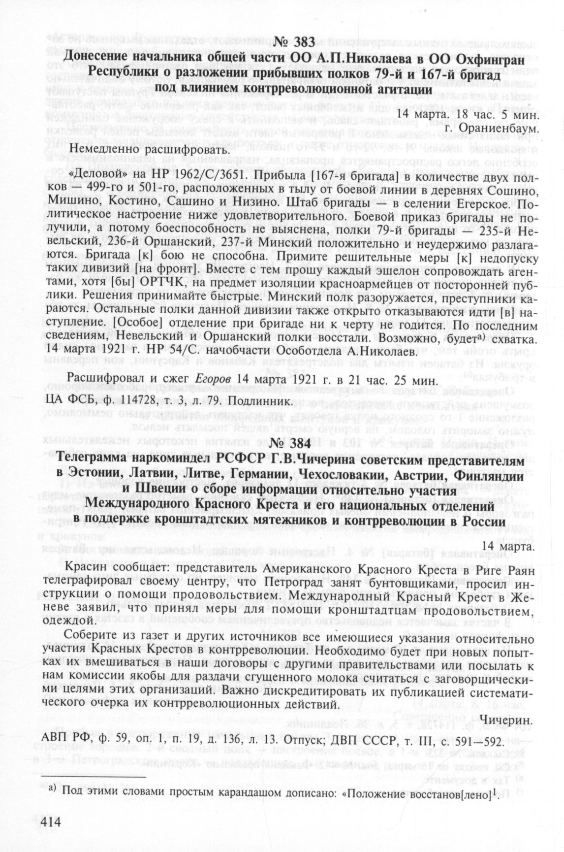 Донесение начальника общей части ОО А.П. Николаева в ОО Охфингран Республики о разложении прибывших полков 79-й и 167-й бригад под влиянием контрреволюционной агитации. 14 марта. 18 час. 5 мин. // ЦА ФСБ, ф. 114728, т. 3, л. 79. Подлинник.