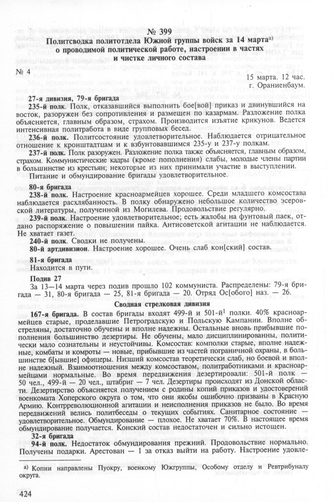 Политсводка политотдела Южной группы войск за 14 марта о проводимой политической работе, настроении в частях и чистке личного состава. 15 марта. 12 час. // ЦА ФСБ, ф. 114728, т. 5, л. 15-16; РЦХИДНИ, ф. 74, оп. 2, д. 79, л. 64-65. Подлинники; ЦГА C.-П., ф. 2411, оп. 1, д. 35, л. 51-52. Заверенная копия.