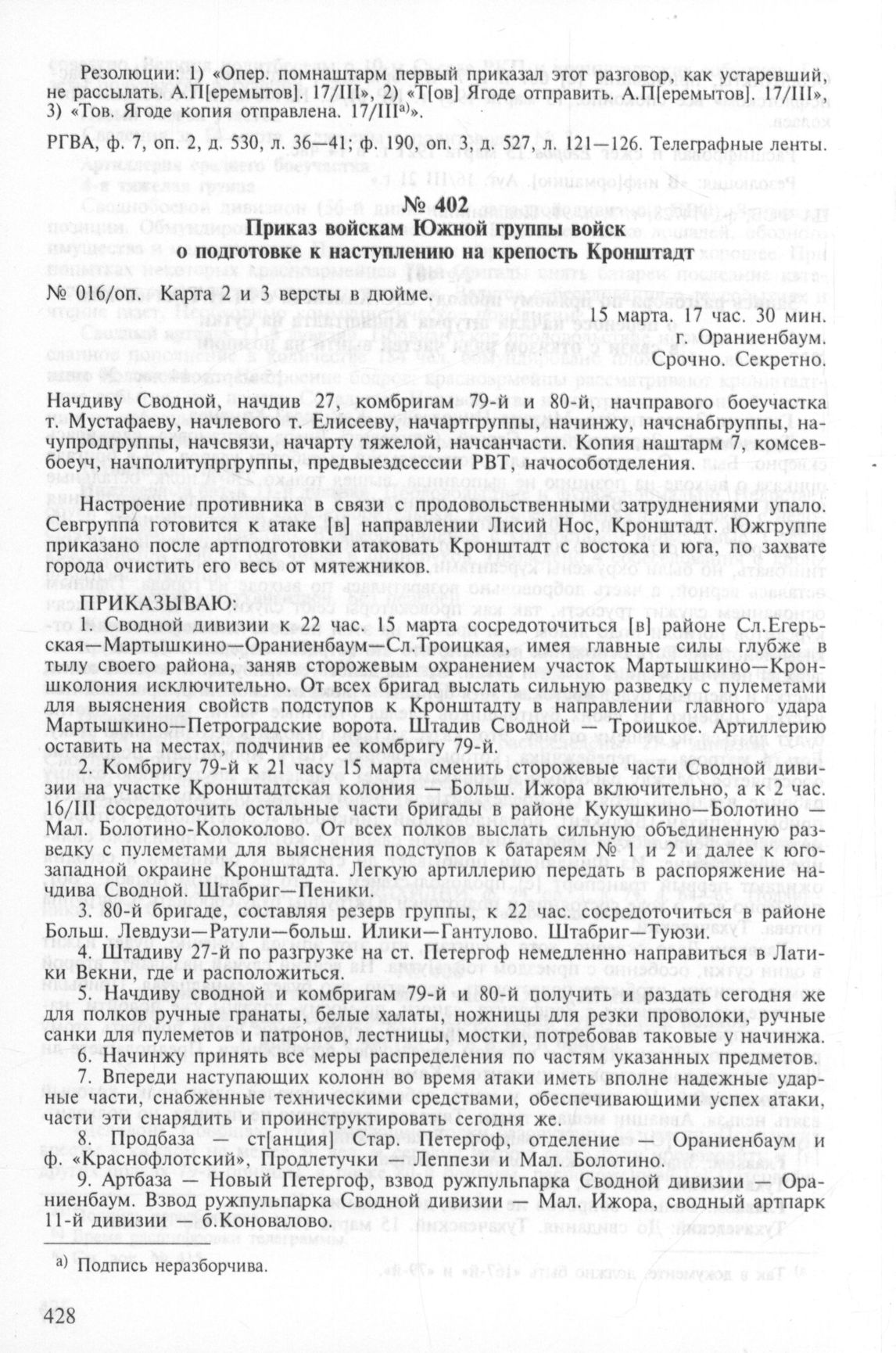 Приказ войскам Южной группы войск о подготовке к наступлению на крепость Кронштадт. 15 марта. 17 час. 30 мин. // РГВА, ф. 264, оп. 1, д. 1, л. 85. Подлинник; л. 86-87. Телеграфная лента; ЦА ФСБ, ф. 114728, т. 4, л. 25 и об. Заверенная копия.