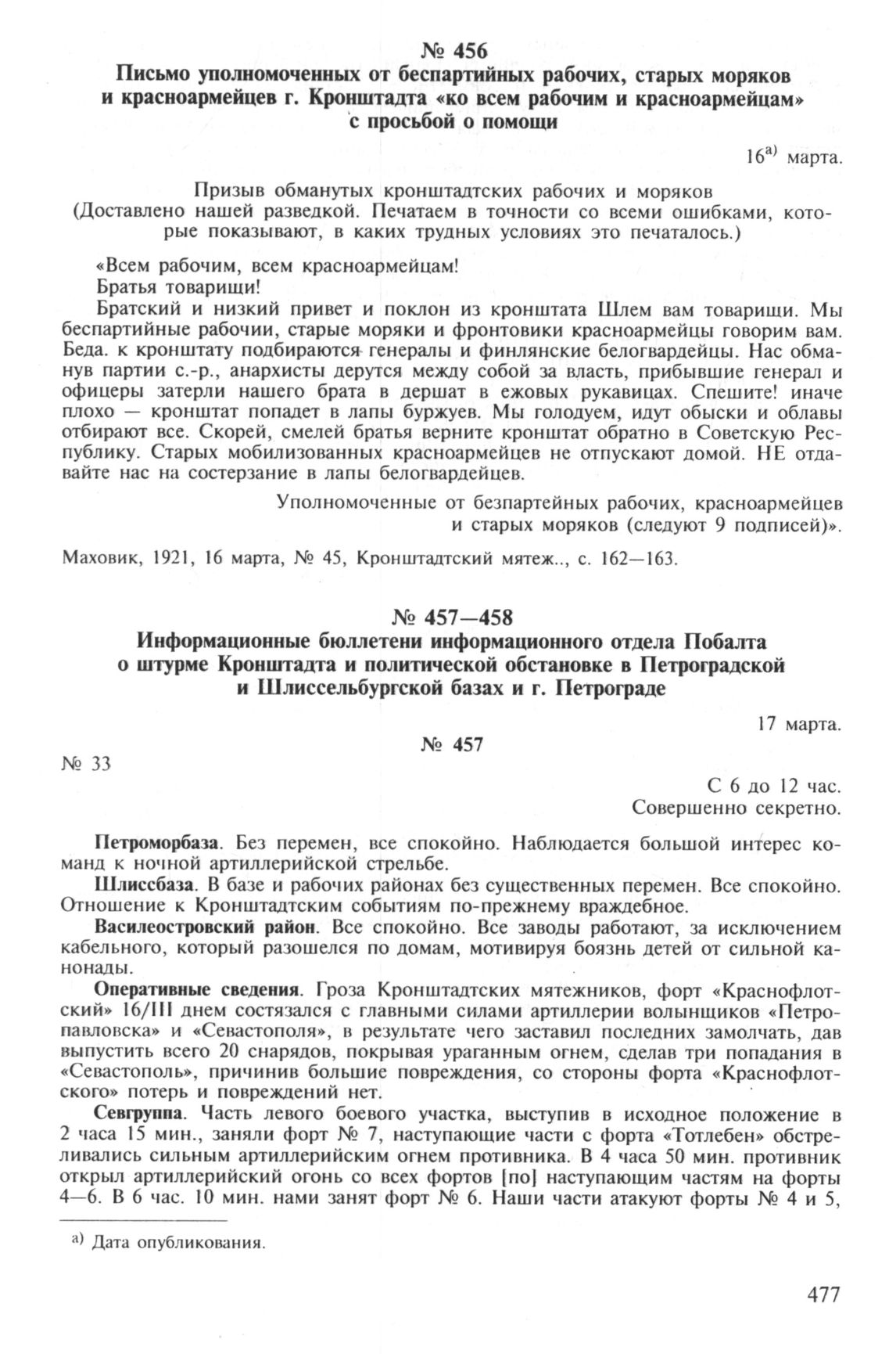 Информационные бюллетени информационного отдела Побалта о штурме Кронштадта и политической обстановке в Петроградской и Шлиссельбургской базах и г. Петрограде. 17 марта. № 33. С 6 до 12 час. // РГА ВМФ, ф. р-93, оп. 1, д. 13, л. 35 и об. Подлинник; д. 11, л. 300 и об. Заверенная копия.