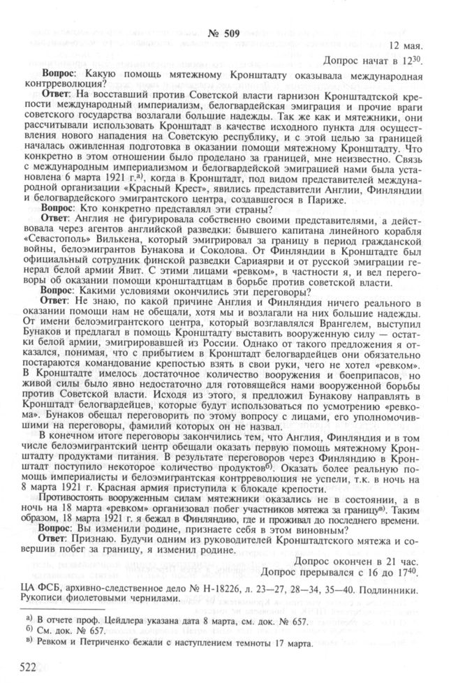 Протоколы допросов бывшего председателя Кронштадтского ВРК С.М. Петриченко о деятельности ревкома и связях с заграницей в дни восстания (27 февраля — 18 марта). 12 мая // ЦА ФСБ, архивно-следственное дело № Н-18226, л. 23-27, 28-34, 35-40. Подлинники. Рукописи фиолетовыми чернилами.