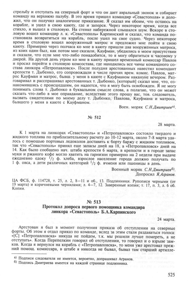 Протокол допроса первого помощника командира линкора «Севастополь» Б.А. Карпинского. 24 марта // ЦА ФСБ, ф. 114728, т. 25, л. 48. Подлинник. Рукопись фиолетовыми чернилами; т. 17, п. 3, л. 2. Копия.