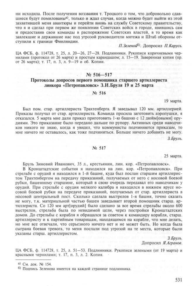 Протоколы допросов первого помощника старшего артиллериста линкора «Петропавловск» З.И. Бруля 19 и 25 марта. 25 марта // ЦА ФСБ, ф. 114728, т. 25, л. 51-53. Подлинники. Рукописи зелеными (от 19 марта) и красными чернилами; т. 17, п. 3, л. 2. Копия.