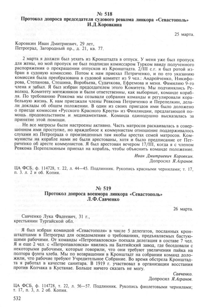 Протокол допроса председателя судового ревкома линкора «Севастополь» И.Д. Коровкина. 25 марта // ЦА ФСБ, ф. 114728, т. 22, л. 44-45. Подлинник. Рукопись красными чернилами; т. 17, п. 3. л. 2 и об. Копия.