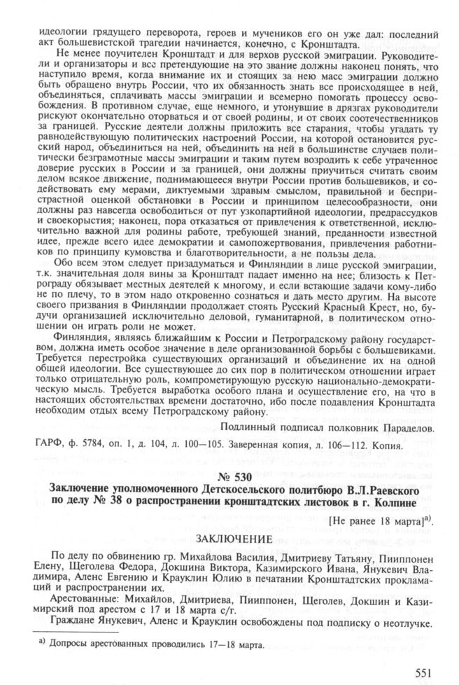 Заключение уполномоченного Детскосельского политбюро B.Л. Раевского по делу № 38 о распространении кронштадтских листовок в г. Колпине. [Не ранее 18 марта] // ЦА ФСБ, ф. 114728, т. 204, л. 6-7 и об. Подлинник.