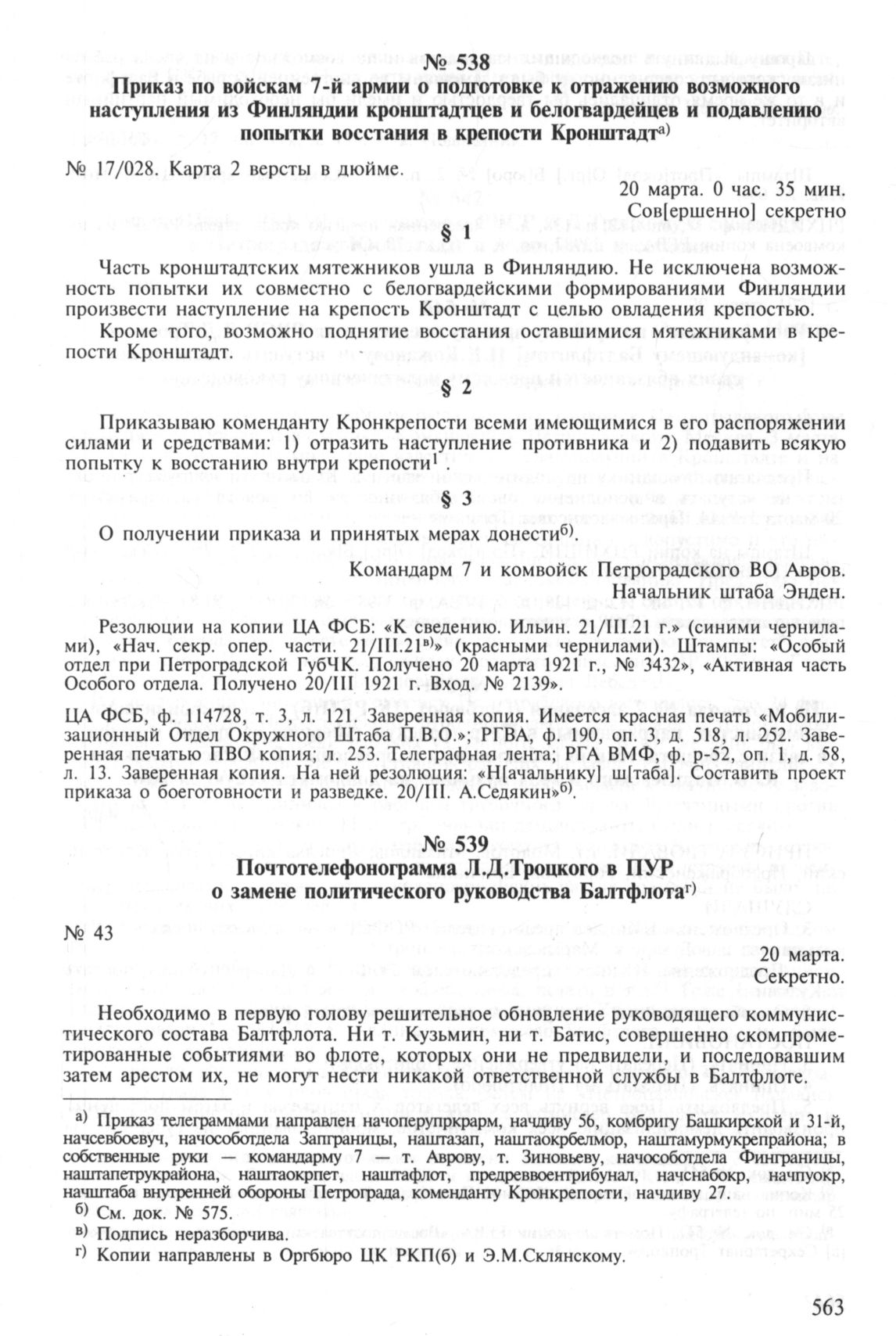 Приказ по войскам 7-ой армии о подготовке к отражению возможного наступления из Финляндии кронштадтцев и белогвардейцев и подавлению попытки восстания в крепости Кронштадт. 20 марта. 0 час. 35 мин. // ЦА ФСБ, ф. 114728, т. 3, л. 121. Заверенная копия. Имеется красная печать «Мобилизационный Отдел Окружного Штаба П.В.О.»; РГВА, ф. 190, оп. 3, д. 518, л. 252. Заверенная печатью ПВО копия; л. 253. Телеграфная лента; РГА ВМФ, ф. р-52, оп. 1, д. 58, л. 13. Заверенная копия. На ней резолюция: «Н[ачальнику] ш[таба]. Составить проект приказа о боеготовности и разведке. 20/III. А.Седякин».