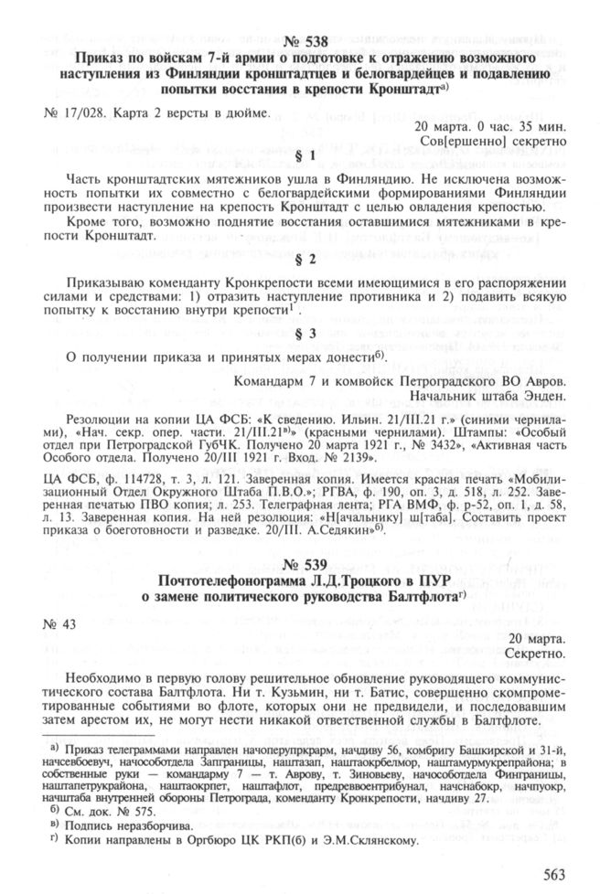Почтотелефонограмма Л.Д. Троцкого в ПУР о замене политического руководства Балтфлота. 20 марта // РЦХИДНИ, ф. 17, оп. 112, д. 138, л. 5. Заверенная печатью председателя РВСР и наркомвоена копия; РГВА, ф. 33987, оп. 3, д. 65, л. 79. Отпуск.