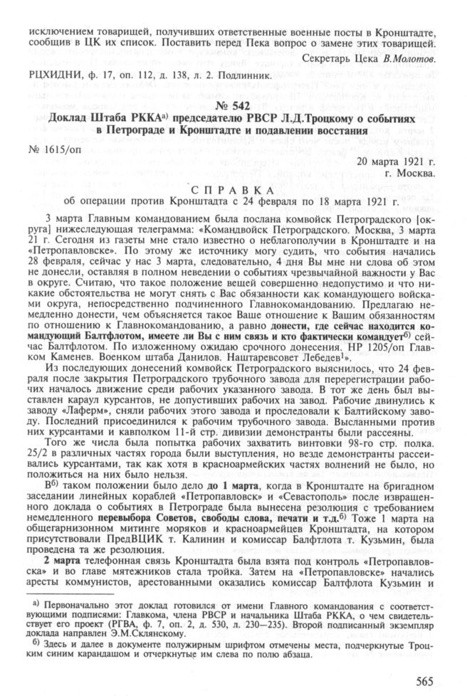 Доклад Штаба РККА председателю РВСР Л.Д. Троцкому о событиях в Петрограде и Кронштадте и подавлении восстания. 20 марта 1921 г. // РГВА, ф. 33987, оп. 2, д. 118, л. 427-433; ф. 33988, оп. 2, д. 368, л. 519-525. Подлинники; ф. 7, оп. 2, д. 530, л. 230, 232-235. Проект с поправками; Советские архивы, 1989, № 1, с. 47-52.