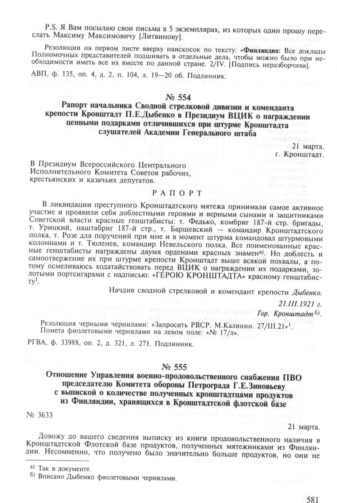 Рапорт начальника Сводной стрелковой дивизии и коменданта крепости Кронштадт П.Е. Дыбенко в Президиум ВЦИК о награждении ценными подарками отличившихся при штурме Кронштадта слушателей Академии Генерального штаба. 21 марта // РГВА, ф. 33988, оп. 2, д. 321, л. 271. Подлинник.