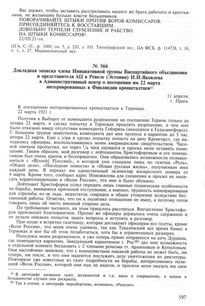 Докладная записка члена Инициативной группы Внепартийного объединения и представителя АЦ в Ревеле (Эстония) И.И. Яковлева в Административный центр о посещении им 22 марта интернированных в Финляндии кронштадтцев. 11 апреля // ГАРФ, ф. 9145, оп. 1, д. 492, л. 13-16 об. Автограф черными чернилами; Л. 8-12. Копия.