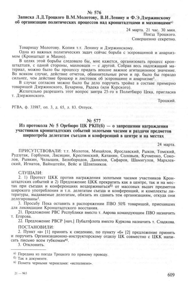 Из протокола № 5 Оргбюро ЦК РКП(б) — о запрещении награждения участников кронштадтских событий золотыми часами и раздачи предметов ширпотреба делегатам съездов и конференций в центре и на местах. 24 марта // РЦХИДНИ, ф. 17, оп. 112, д. 141, л. 2, 3. Подлинник.