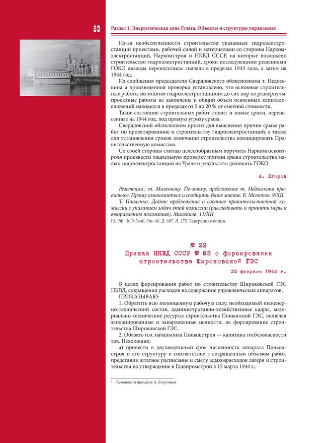Приказ НКВД СССР № 83 о форсировании строительства Широковской ГЭС. 25 февраля 1944 г. // ГА РФ. Ф. Р-9401. Оп. 1а. Д. 166. Л. 147, 147 об. Ротаторный экз.
