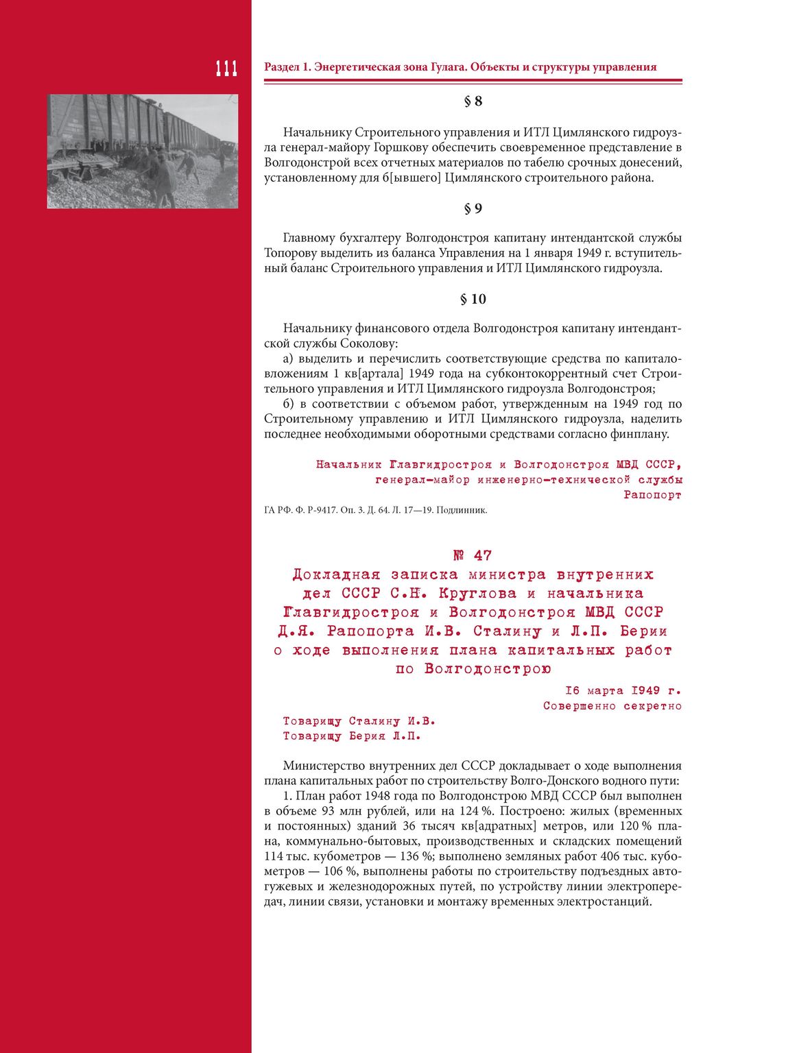 Докладная записка министра внутренних дел СССР С.Н. Круглова и начальника Главгидростроя и Волгодонстроя МВД СССР Д.Я. Рапопорта И.В. Сталину и Л.П. Берии о ходе выполнения плана капитальных работ по Волгодонстрою. 16 марта 1949 г. // ГА РФ. Ф. Р-9401. Оп. 2. Д. 234. Л. 274-282. Заверенная копия.
