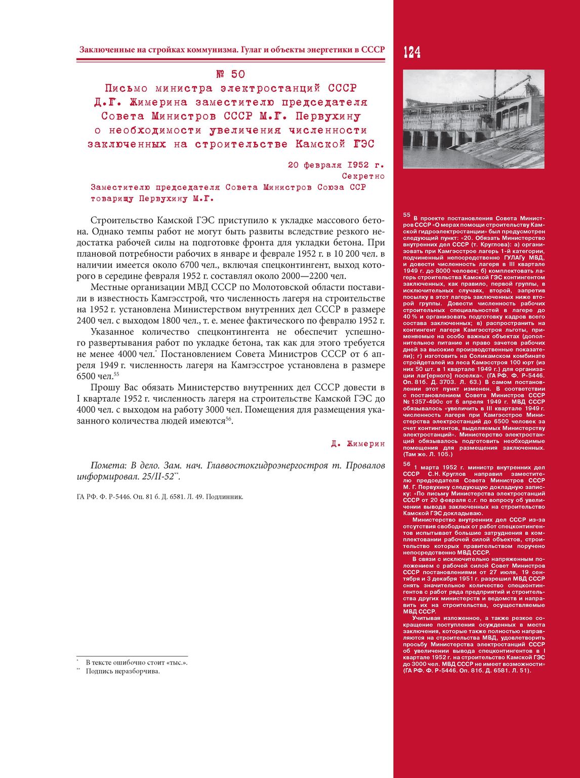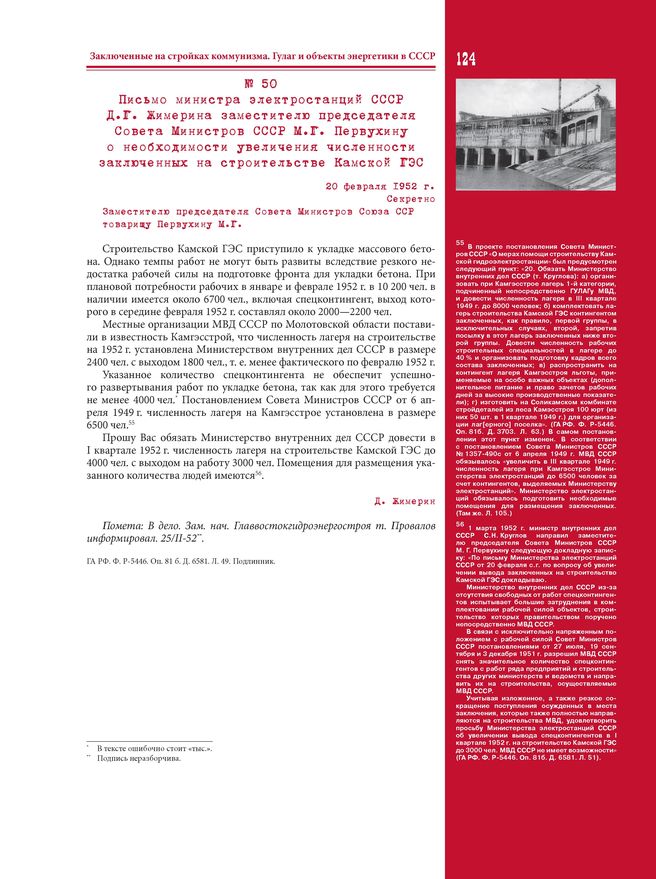 Письмо министра электростанций СССР Д.Г. Жимерина заместителю председателя Совета Министров СССР М.Г. Первухину о необходимости увеличения численности заключенных на строительстве Камской ГЭС. 20 февраля 1952 г. // ГА РФ. Ф. Р-5446. Оп. 81 б. Д. 6581. Л. 49. Подлинник.