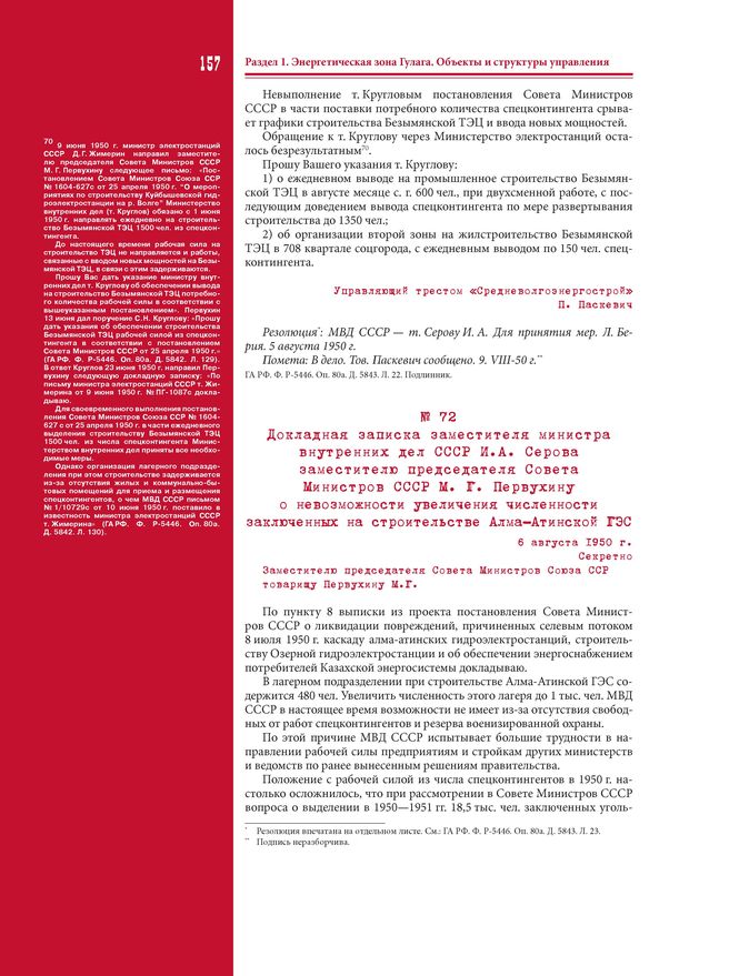 Докладная записка заместителя министра внутренних дел СССР И.А. Серова заместителю председателя Совета Министров СССР М.Г. Первухину о невозможности увеличения численности заключенных на строительстве Алма-Атинской ГЭС. 6 августа 1950 г.