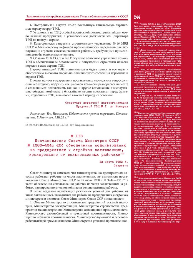 Постановление Совета Министров СССР № 1280—424с «Об обеспечении использования на предприятиях и стройках заключенных, изолированно от вольнонаемных рабочих». 12 марта 1952 г. // ГА РФ. Ф. Р-5446. Оп. 86а. Д. 7471. Л. 17-18. Заверенная копия.