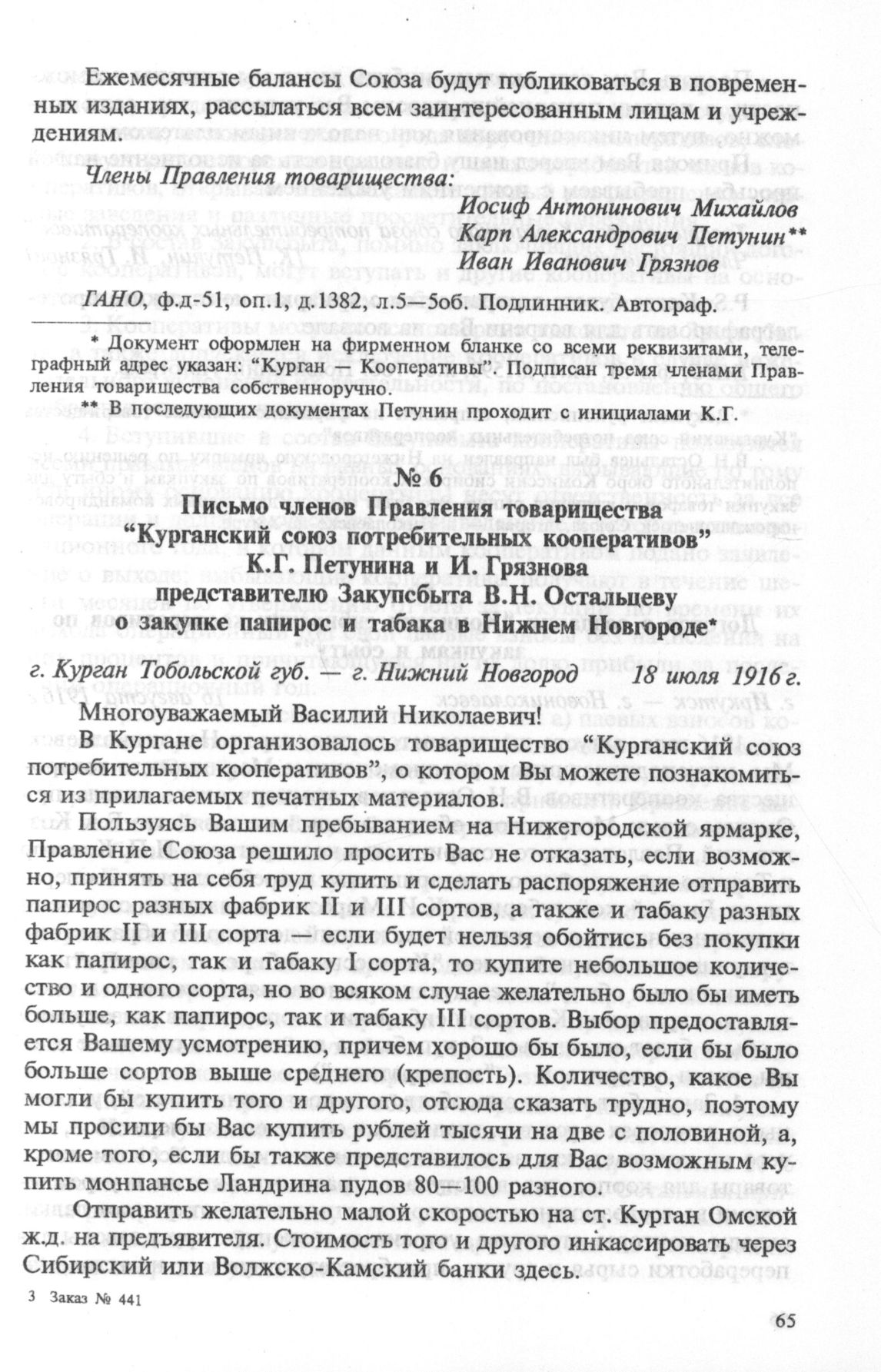 Письмо членов Правления товарищества “Курганский союз потребительных кооперативов” К.Г. Петунина и И. Грязнова представителю Закупсбыта В.Н. Остальцеву о закупке папирос и табака в Нижнем Новгороде. 18 июля 1916 г. // ГАНО. ф.д-51. оп.1. д.1590. л.6—7об. Подлинник. Автограф.