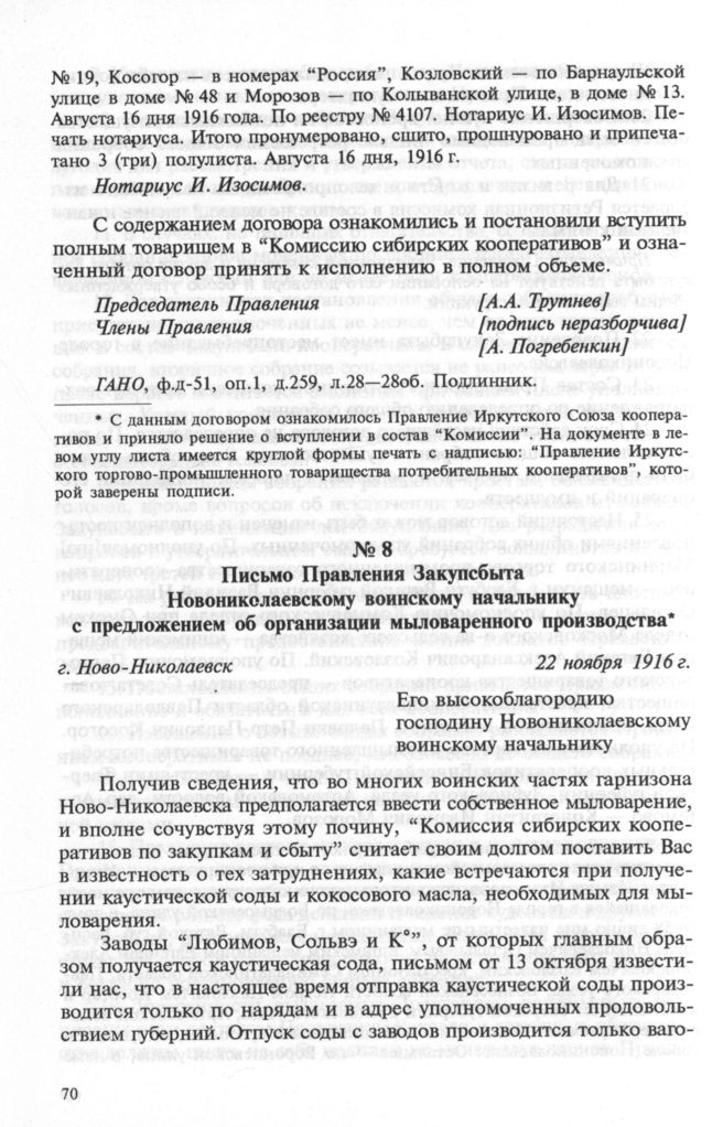 Письмо Правления Закупсбыта Новониколаевскому воинскому начальнику с предложением об организации мыловаренного производства. 22 ноября 1916 г. // ГАНО. ф.д-51. оп.1. д.880. л.122— 122об. Незаверенная копия.