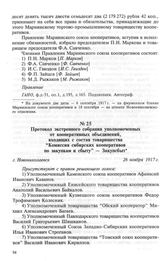 Протокол экстренного собрания уполномоченных от кооперативных объединений, входящих с состав товарищества “Комиссия сибирских кооперативов по закупкам и сбыту” — Закупсбыт. 26 ноября 1917 г.