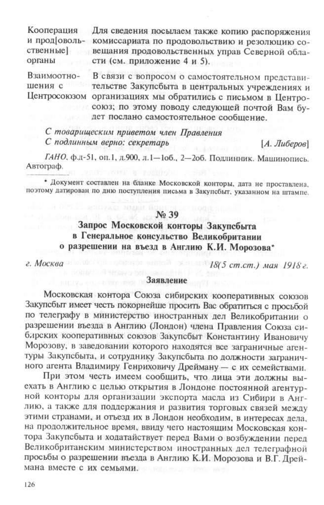 Запрос Московской конторы Закупсбыта в Генеральное консульство Великобритании о разрешении на въезд в Англию К.И. Морозова. 18(5 cт.cт.) мая 1918 г. // ГАНО. ф.д-51. оп.1. д.919. л.79—79об. Подлинник. Машинопись. Автограф.