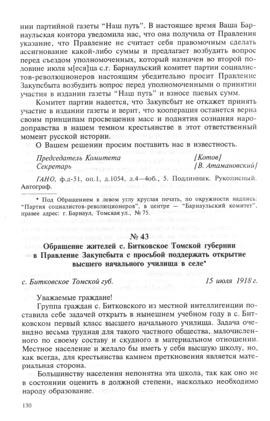 Обращение жителей с. Битковское Томской губернии в Правление Закупсбыта с просьбой поддержать открытие высшего начального училища в селе. 15 июля 1918 г. // ГАНО. ф.д-51. оп.1. д.1054. л.3—3об. Подлинник. Машинопись. Автограф.