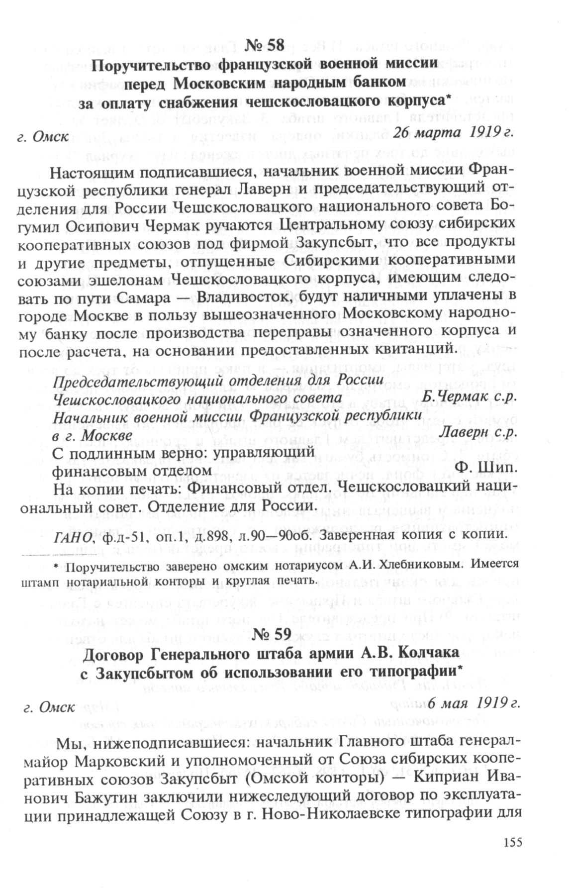 Поручительство французской военной миссии перед Московским народным банком за оплату снабжения чешскословацкого корпуса. 26 марта 1919 г. // ГАНО. ф.д-51. оп.1. д.898. л.90—90об. Заверенная копия с копии.