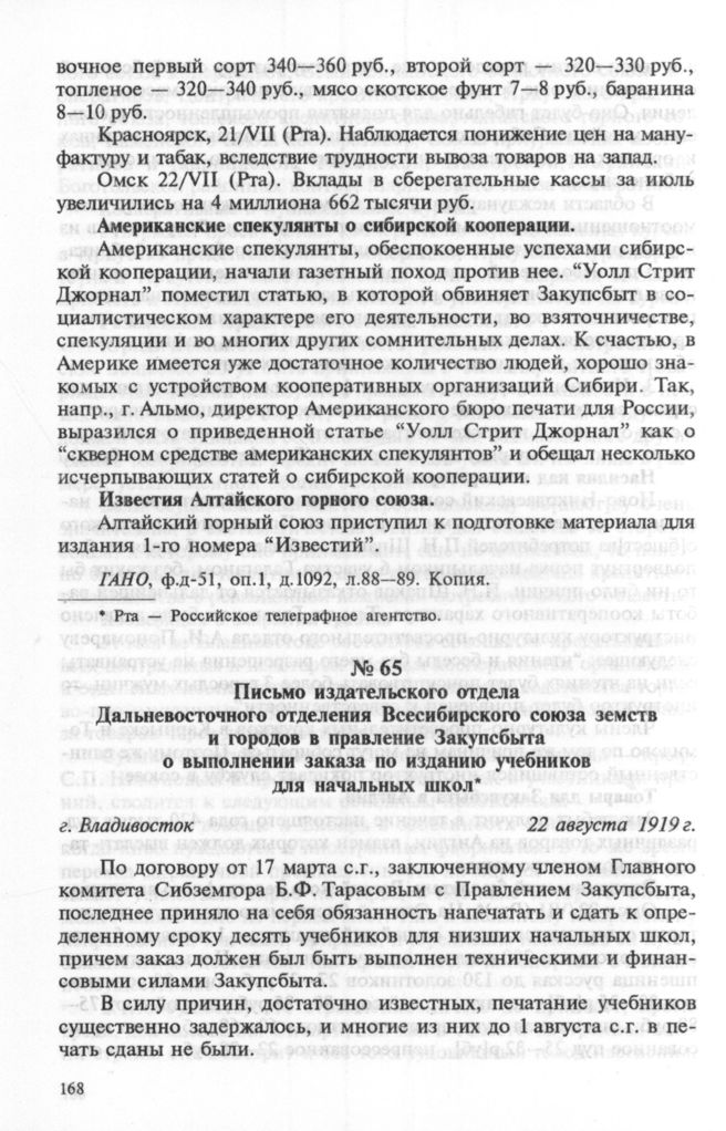 Письмо издательского отдела Дальневосточного отделения Всесибирского союза земств и городов в правление Закупсбыта о выполнении заказа по изданию учебников для начальных школ. 22 августа 1919 г. // ГАНО. ф.д-51. оп.1. д.1121. л.156— 157об. Подлинник.