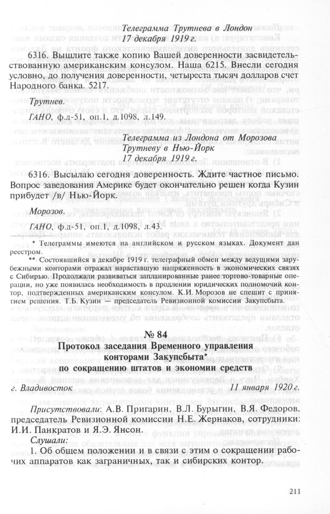 Протокол заседания Временного управления конторами Закупсбыта по сокращению штатов и экономии средств. 11 января 1920 г. // ГАНО. ф.д-51. оп.1. д.981. л.123—124. Заверенная копия.