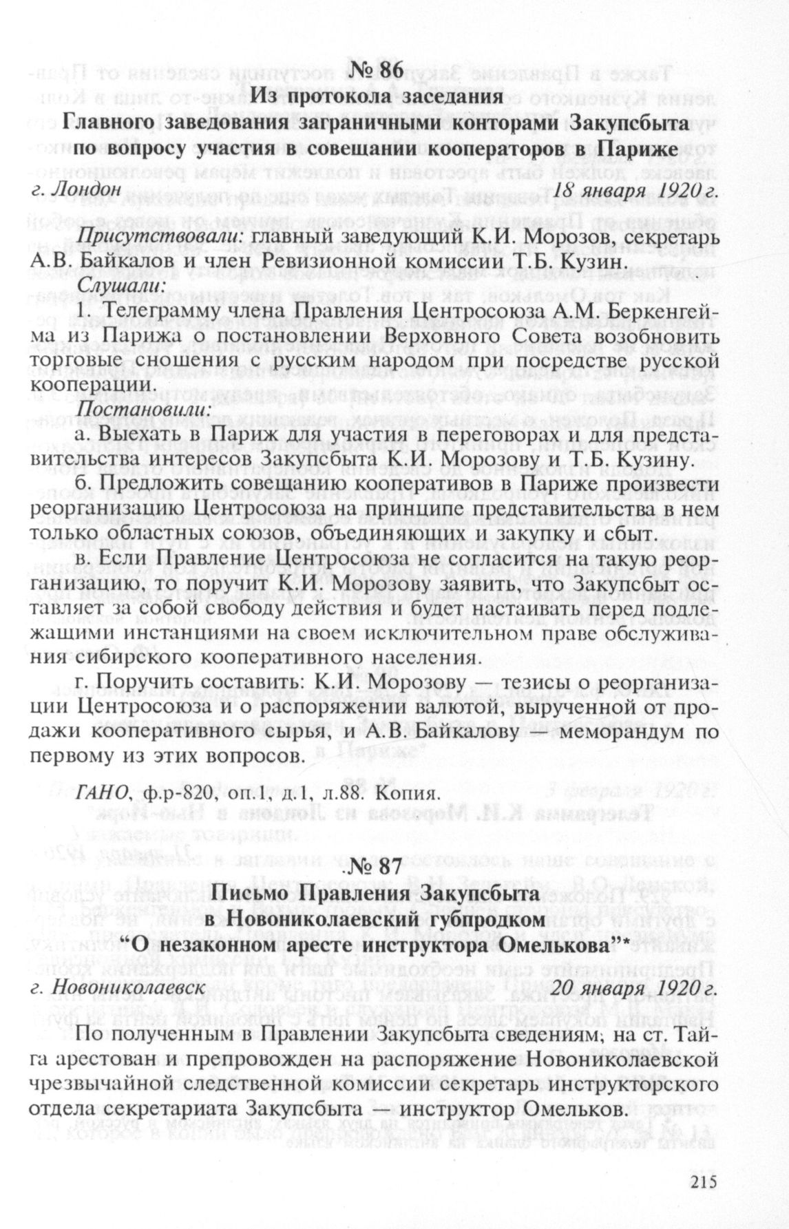 Из протокола заседания Главного заведования заграничными конторами Закупсбыта по вопросу участия в совещании кооператоров в Париже. 18 января 1920 г. // ГАНО. ф.р-820. оп.1. д.1. л.88. Копия.