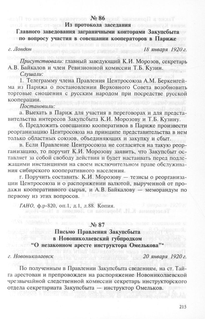 Письмо Правления Закупсбыта в Новониколаевский губпродком “О незаконном аресте инструктора Омелькова”. 20 января 1920 г. // ГАНО. ф.д-51. оп.1. д.1291. л.28—28об. Подлинник. Машинопись.