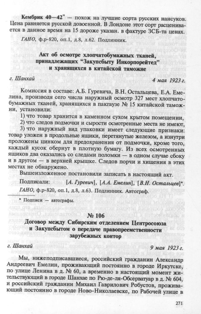 Договор между Сибирским отделением Центросоюза и Закупсбытом о передаче правопреемственности зарубежных контор. 9 мая 1923 г. // ГАНО. ф.р-820. оп.1. д.6. л. 1—4. Подлинник. Автограф.