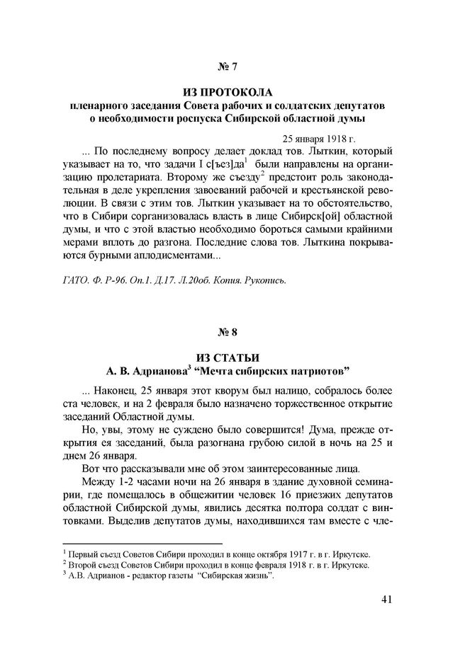 Из протокола пленарного заседания Совета рабочих и солдатских депутатов о необходимости роспуска Сибирской областной думы. 25 января 1918 г. // ГАТО. Ф. Р-96. Оп.1. Д.17. Л.20об. Копия. Рукопись.