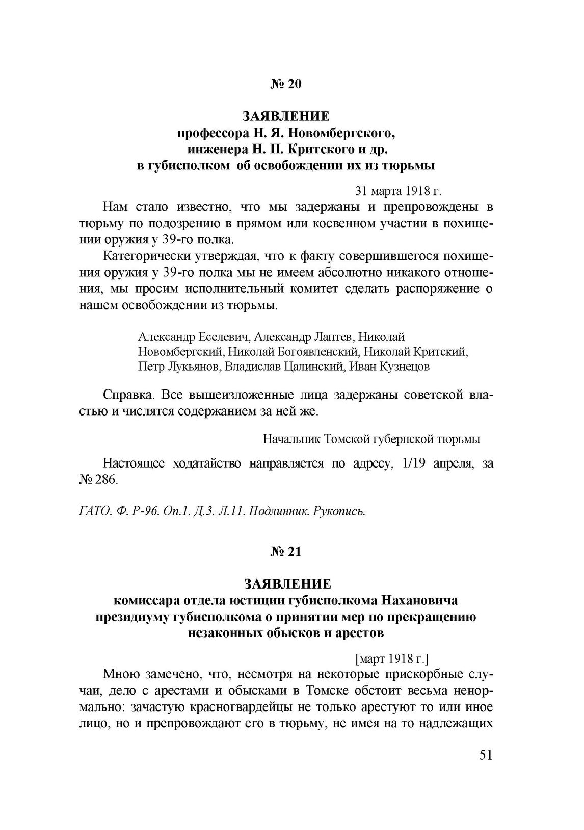 Заявление профессора Н.Я. Новомбергского, инженера Н.П. Критского и др. в губисполком об освобождении их из тюрьмы. 31 марта 1918 г. // ГАТО. Ф. Р-96. Оп.1. Д.3. Л.11. Подлинник. Рукопись.