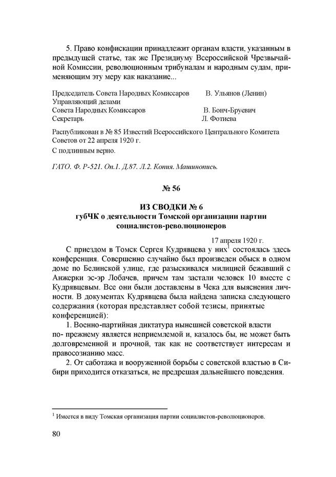 Из сводки № 6 губЧК о деятельности Томской организации партии социалистов-революционеров. 17 апреля 1920 г. // Архив УФСБ по Томской области. Д-34. Л.7. Подлинник. Машинопись.