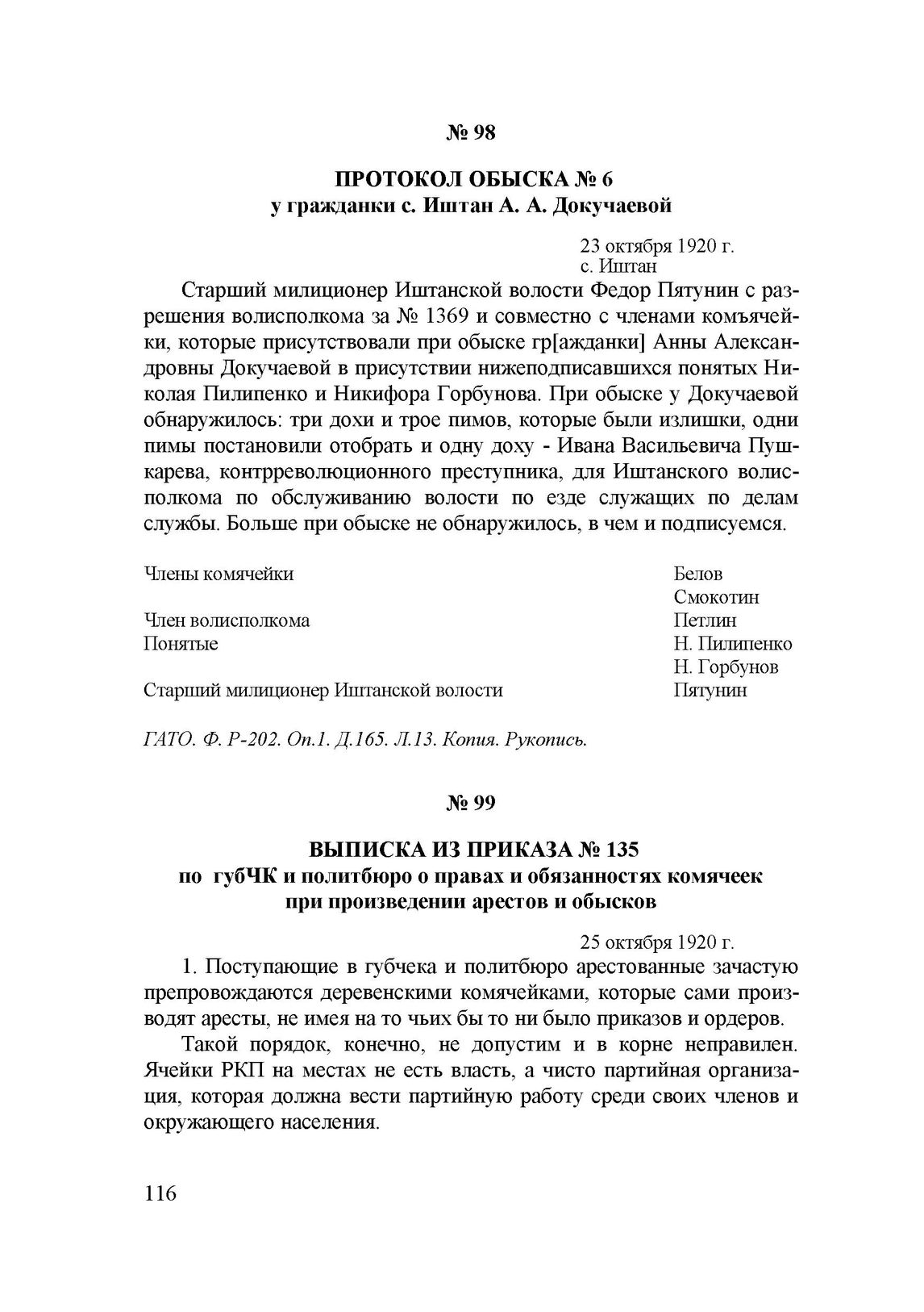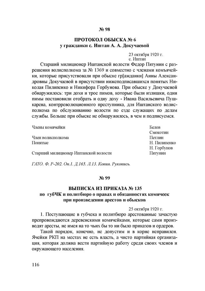 Протокол обыска № 6 у гражданки с. Иштан А.А. Докучаевой. 23 октября 1920 г. // ГАТО. Ф. Р-202. Оп.1. Д.165. Л.13. Копия. Рукопись.