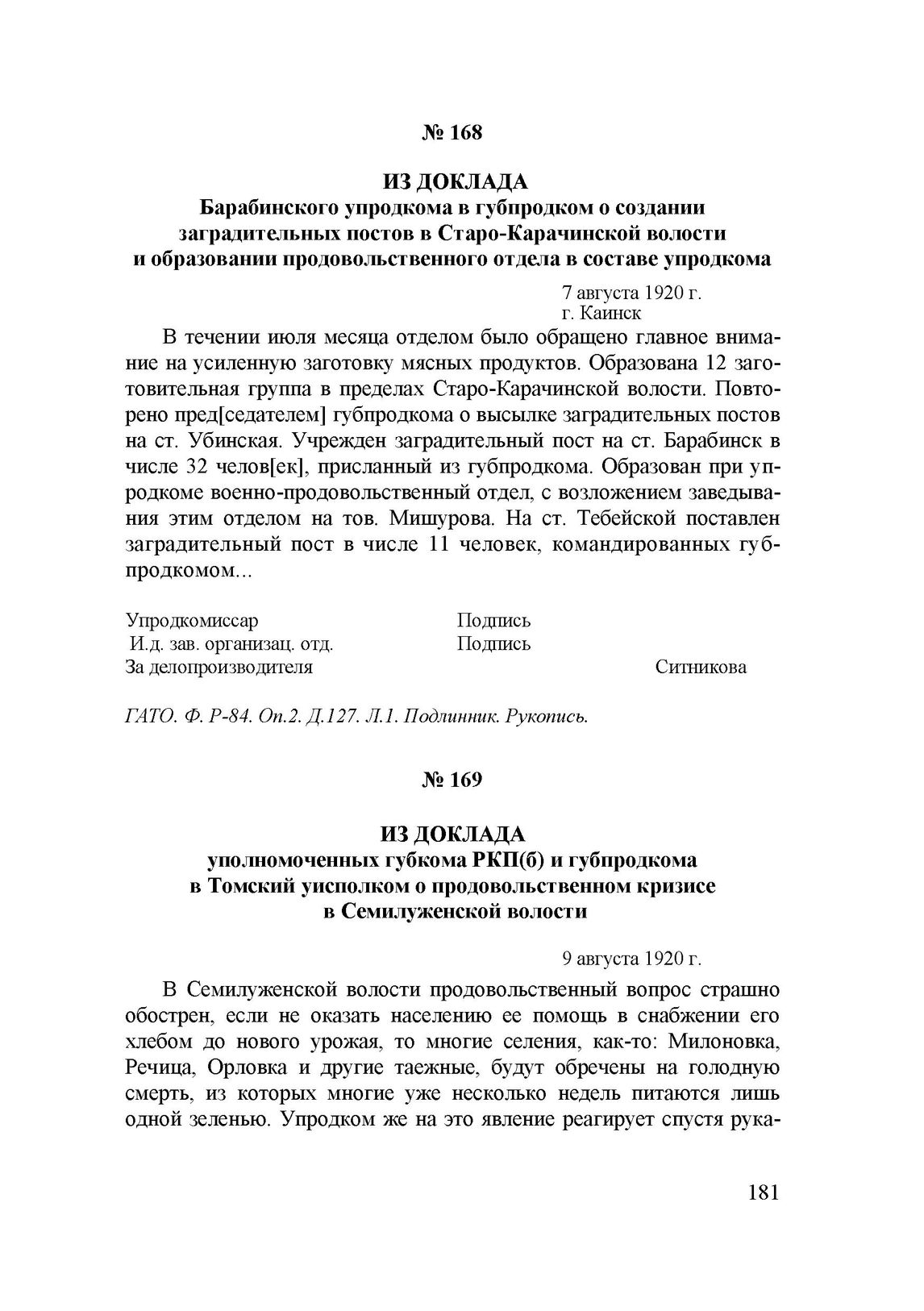 Из доклада Барабинского упродкома в губпродком о создании заградительных постов в Старо-Карачинской волости и образовании продовольственного отдела в составе упродкома. 7 августа 1920 г. // ГАТО. Ф. Р-84. Оп.2. Д.127. Л.1. Подлинник. Рукопись.