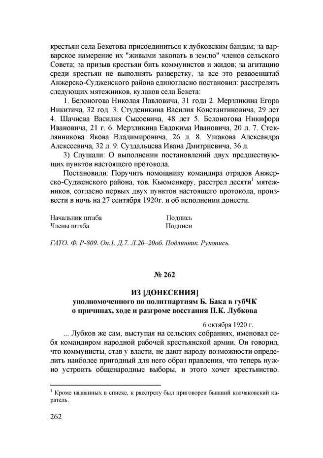 Из донесения уполномоченного по политпартиям Б. Бака в губЧК о причинах, ходе и разгроме восстания П.К. Лубкова. 6 октября 1920 г. // ГАТО. Ф. Р-809. Оп.1. Д.7. Л.100–104. Подлинник. Машинопись.