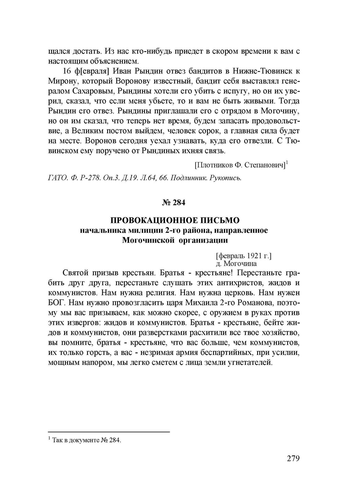 Провокационное письмо начальника милиции 2-го района, направленное Могочинской организации. [Февраль 1921 г.] // ГАТО. Ф. Р-278. Оп.3. Д.19. Л.65. Копия. Машинопись. Рукопись.