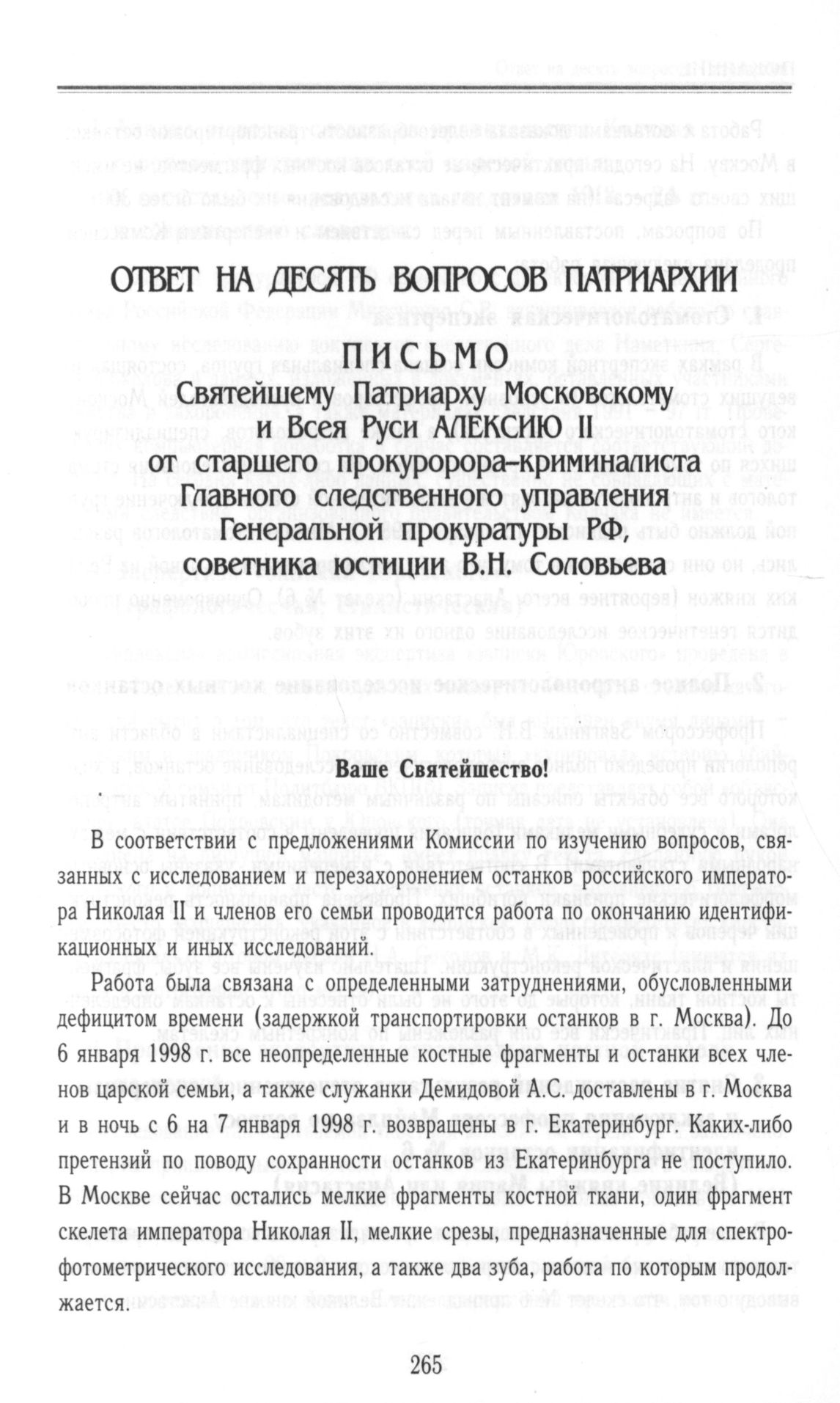Ответ на десять вопросов Патриархии. Письмо Святейшему Патриарху Московскому и Всея Руси Алексию II от Старшего прокурора-криминалиста Главного следственного управления Генеральной прокуратуры РФ В.Н. Соловьева. 15.01.98 г.