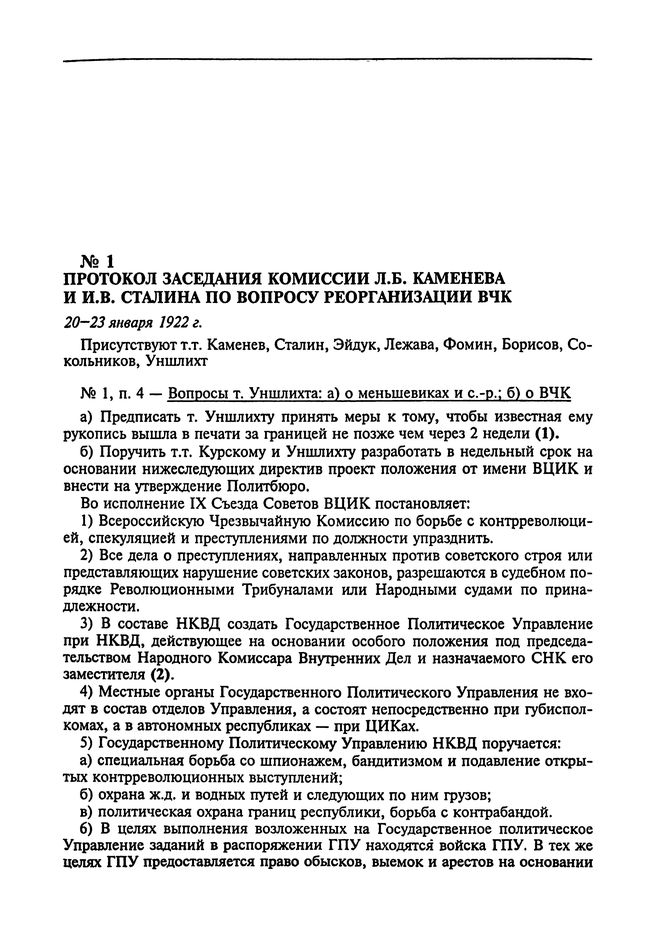 Протокол заседания Комиссии Л.Б. Каменева и И.В. Сталина по вопросу реорганизации ВЧК. 20-23 января 1922 г.
