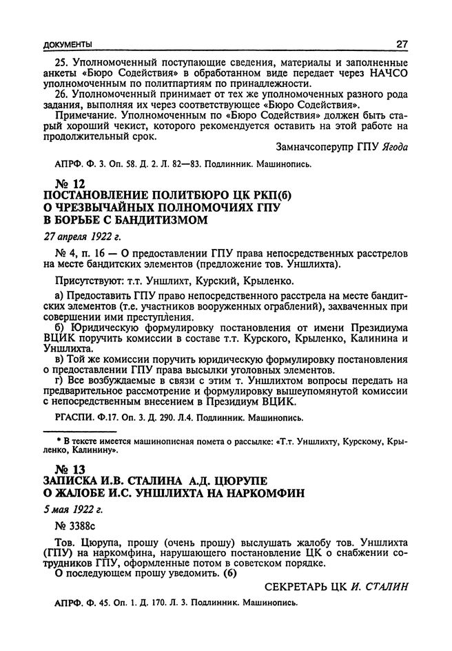 Постановление Политбюро ЦК РКП(б) о чрезвычайных полномочиях ГПУ в борьбе с бандитизмом. 27 Апреля 1922 г.