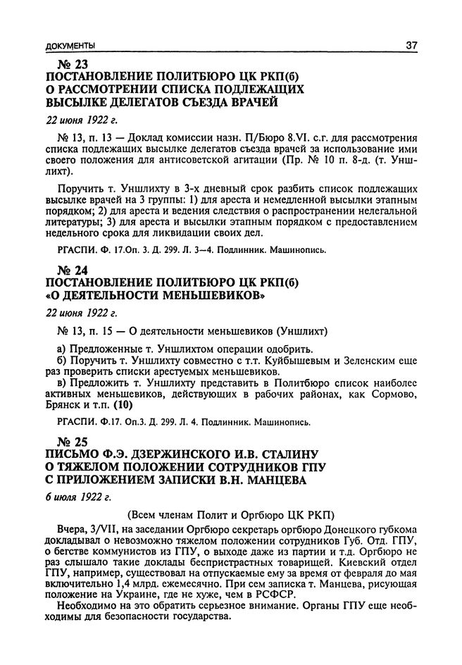 Постановление Политбюро ЦК РКП(б) «О деятельности меньшевиков». 22 Июня 1922 г. // РГАСПИ. Ф. 17. Оп. 3. Д. 299. Л. 4. Подлинник. Машинопись.