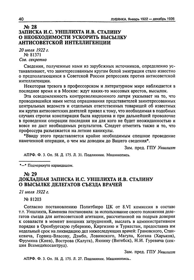 Докладная Записка И.С. Уншлихта И.В. Сталину о высылке делегатов съезда врачей. 21 Июля 1922 г. // АПРФ. Ф. 3. Оп. 58. Д. 175. Л. 27. Подлинник. Машинопись.