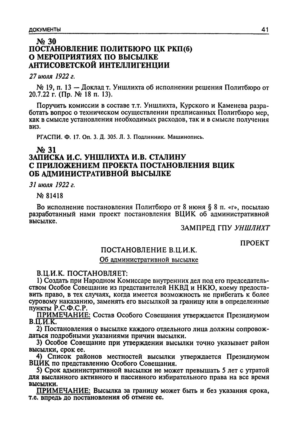 Записка И.С. Уншлихта И.В. Сталину с приложением проекта постановления ВЦИК об административной высылке. 31 Июля 1922 г. // АПРФ. Ф. 3. Оп. 58. Д. 175. Л. 33-34. Подлинник. Машинопись.