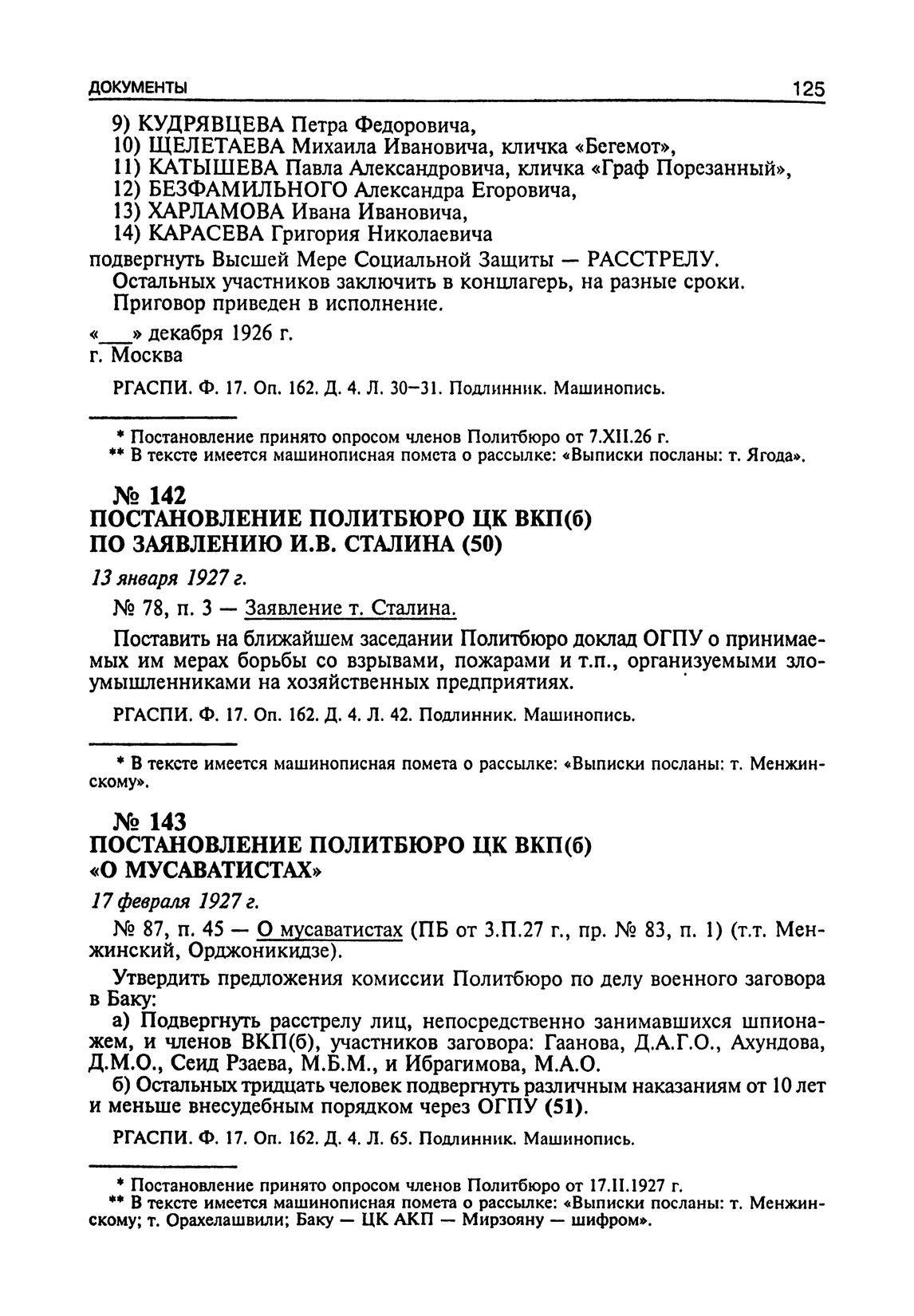 Постановление Политбюро ЦК ВКП(б) «О мусаватистах». 17 Февраля 1927 г. // РГАСПИ. Ф. 17. Оп. 162. Д. 4. Л. 65. Подлинник. Машинопись.
