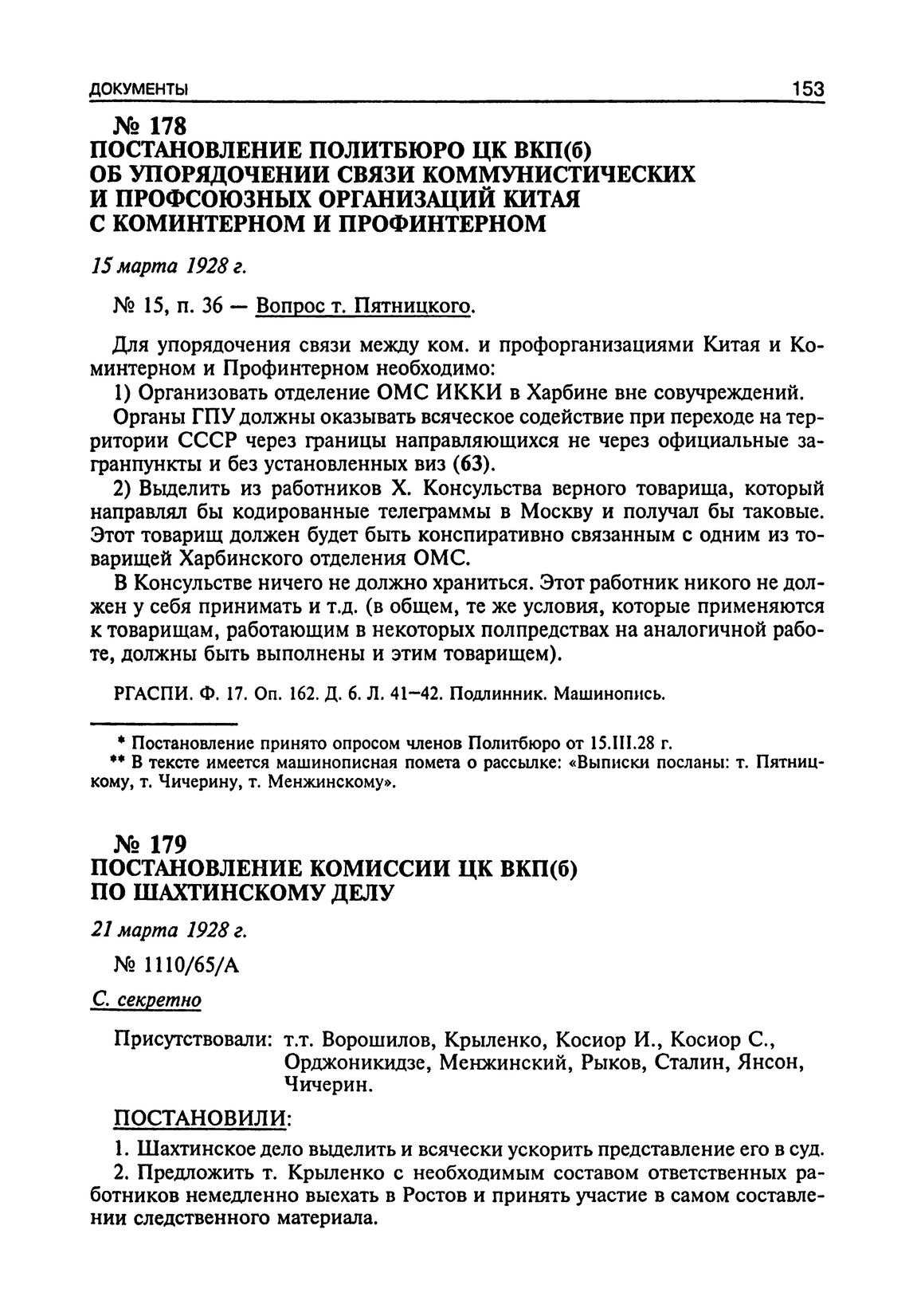 Постановление Политбюро ЦК ВКП(б) об упорядочении связи коммунистических и профсоюзных организаций Китая с Коминтерном и Профинтерном. 15 Марта 1928 г. // РГАСПИ. Ф. 17. Оп. 162. Д. 6. Л. 41-42. Подлинник. Машинопись.