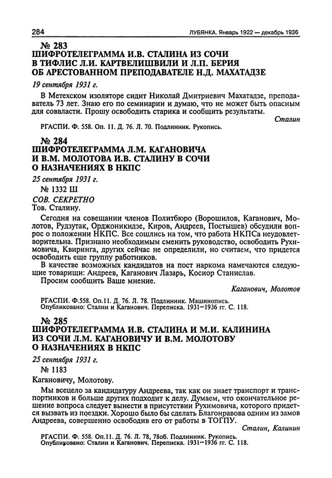 Лубянка. Сталин и ВЧК-ГПУ-ОГПУ-НКВД. Архив Сталина. Документы высших органов партийной и государственной власти. Январь 1922—декабрь 1936. — М.: МФД, 2003.