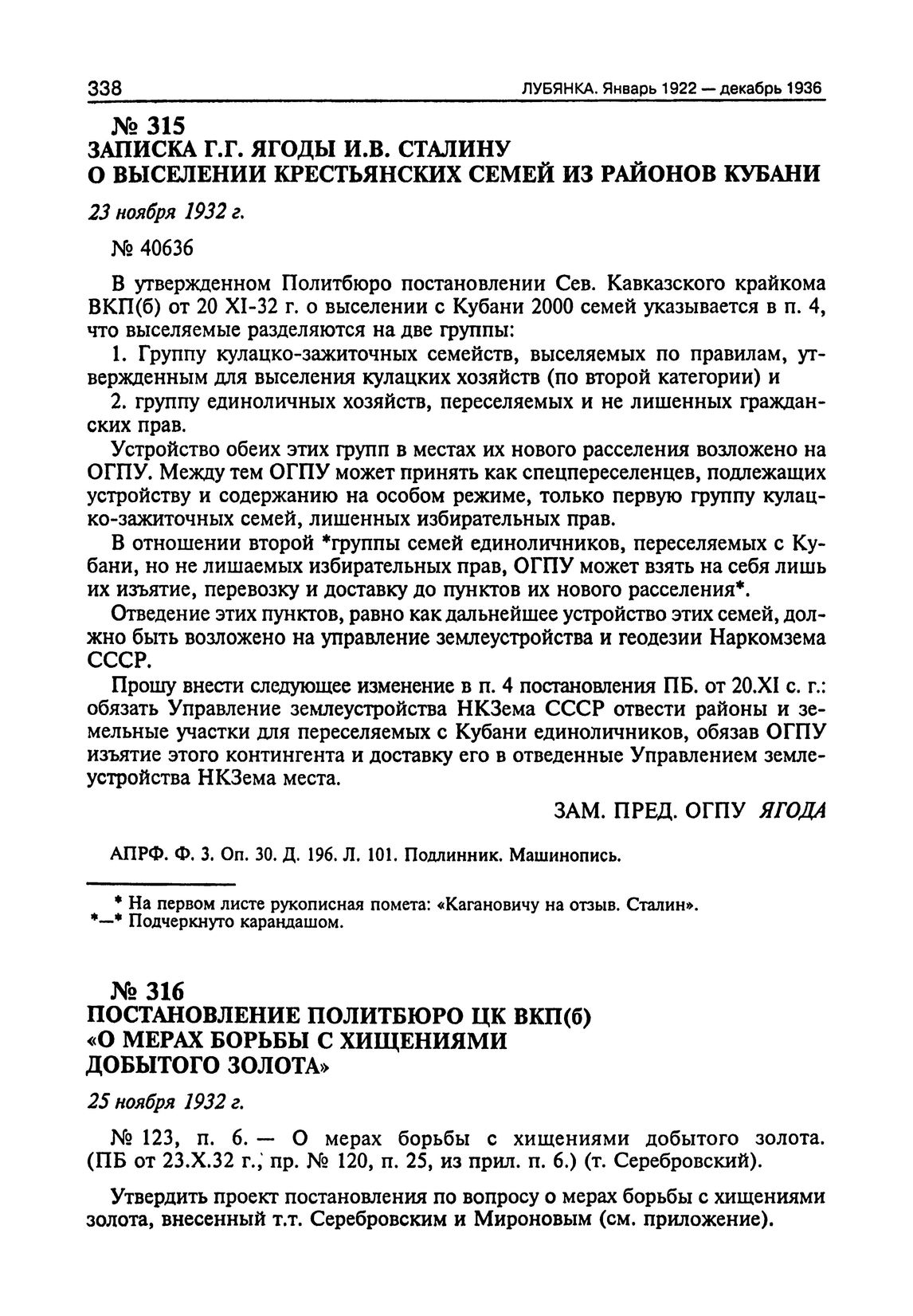 Лубянка. Сталин и ВЧК-ГПУ-ОГПУ-НКВД. Архив Сталина. Документы высших органов партийной и государственной власти. Январь 1922—декабрь 1936. — М.: МФД, 2003.