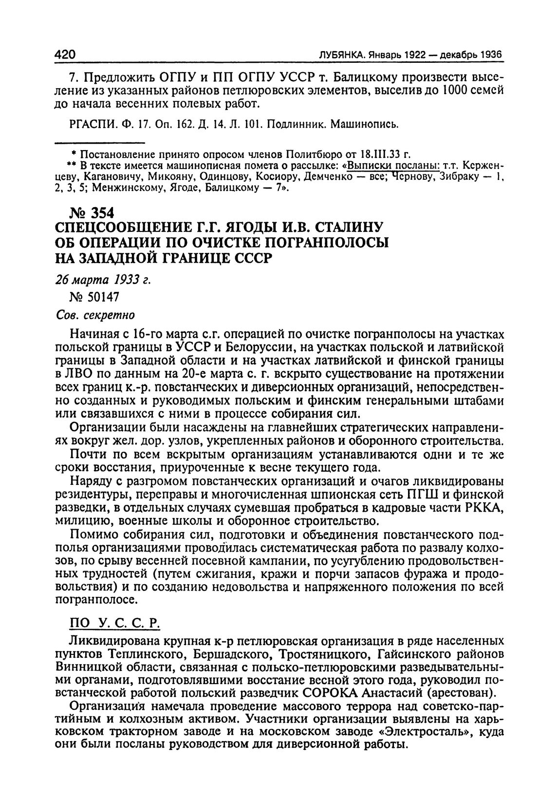 Спецсообщение Г.Г. Ягоды И.В. Сталину об операции по очистке погранполосы на западной границе СССР. 26 Марта 1933 г.