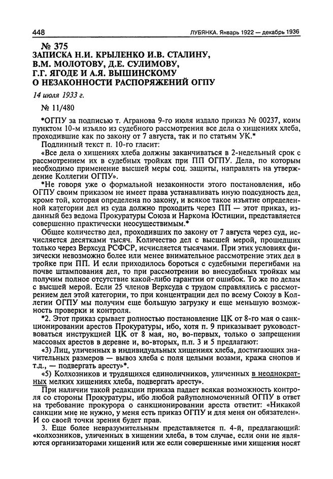 Записка Н.И. Крыленко И.В. Сталину, В.М. Молотову, Д.Е. Сулимову, Г.Г. Ягоде и А.Я. Вышинскому о незаконности распоряжений ОГПУ. 14 Июля 1933 г.